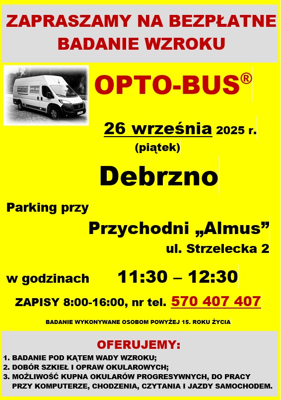 Informujemy, że 26 września br. na parkingu przy przychodni ALMUS w Debrznie na ul. Strzeleckiej 2 będzie możliwość wzięcia udziału w bezpłatnym komputerowym badaniu wzroku. Opto-bus stacjonował będzie w godzinach 11:30-12:30. Na badanie obowiązują zapisy pod numerem 570 407 407.