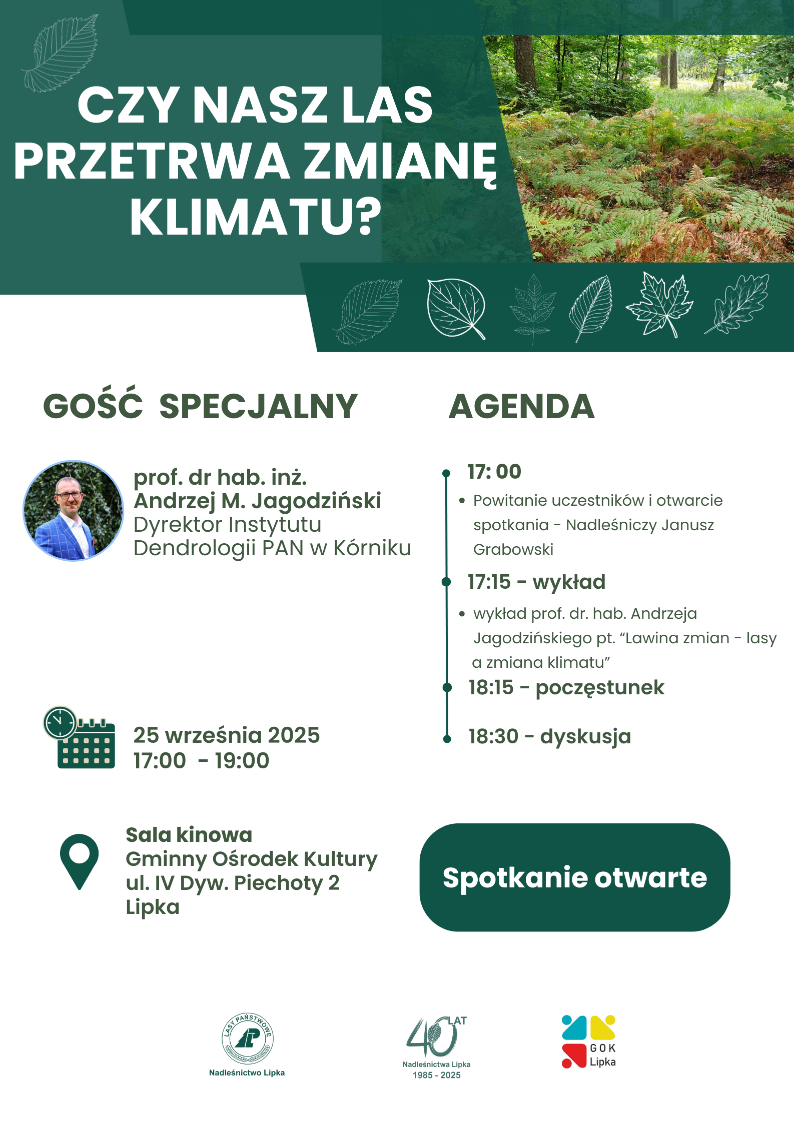 Zapraszamy na spotkanie otwarte z prof. dr. hab. Andrzejem M. Jagodzińskim, poświęcone zagadnieniu jak będzie zmieniał się las w dobie zmiany klimatu, które odbędzie się 25.09.2025 r. o godz. 17:00 w Sali kinowej Gminnego Ośrodka Kultury w Lipce.