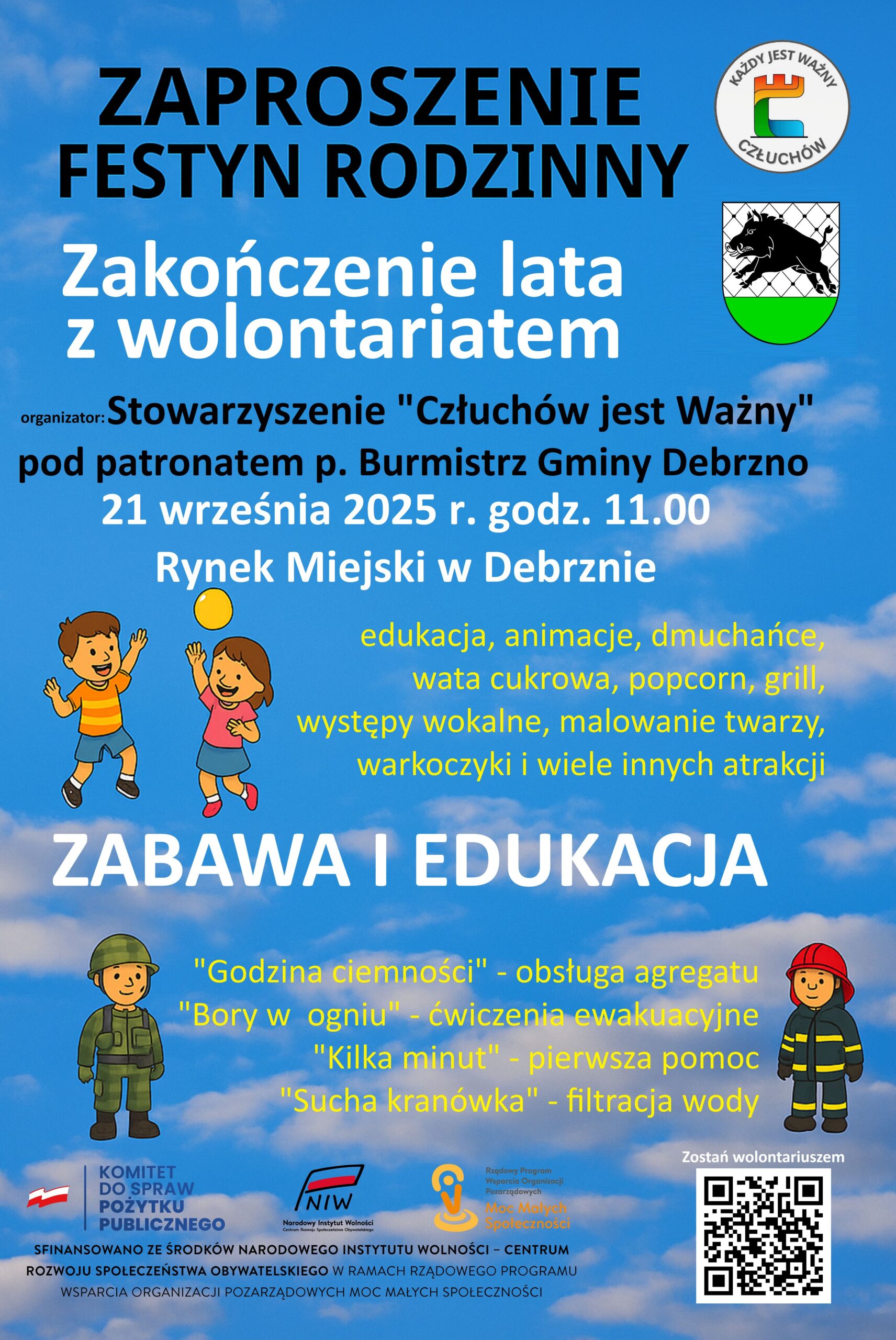 Zapraszamy na Festyn Rodzinny – Zakończenie Lata z Wolontariatem, który odbędzie się 21 września br., o godz. 11:00 na Rynku Miejskim w Debrznie.