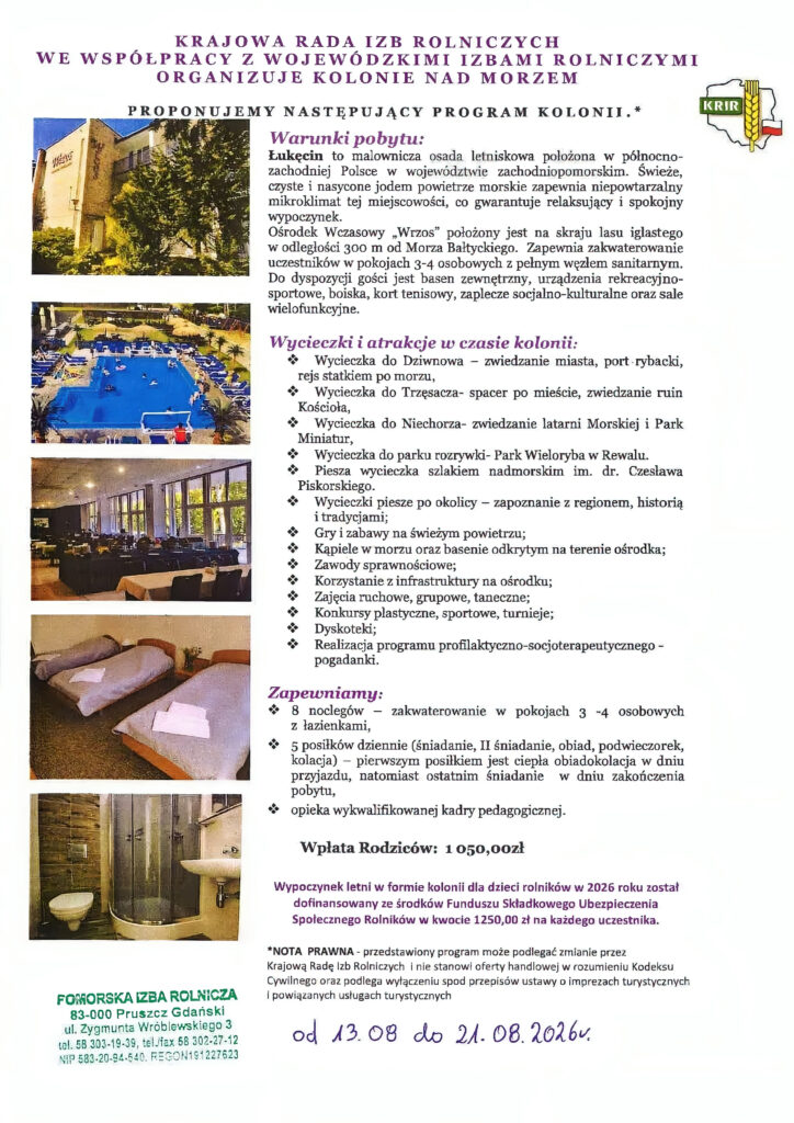 Pomorska Izba Rolnicza uprzejmie informuje, iż organizuje wyjazd na kolonie dla dzieci rolników nad morze. Zainteresowanych prosimy o kontakt z naszymi Biurami Powiatowymi oraz Biurem w Pruszczu Gdańskim.