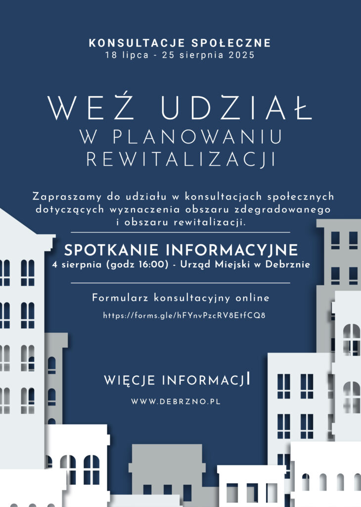 Zachęcamy Państwa do wzięcia udziału w konsultacjach społecznych projektu Uchwały Rady Miejskiej w Debrznie w sprawie wyznaczenia obszaru zdegradowanego i obszaru rewitalizacji. Uwagi do projektu uchwały można zgłaszać w formie elektronicznej (formularz elektroniczny) lub za pomocą formularza tradycyjnego. W trakcie trwania konsultacji zaplanowano również spotkanie informacyjne dla mieszkańców. Wszystkie informacje i szczegółowy tryb konsultacji się określa poniższe zarządzenie wraz z załącznikami.