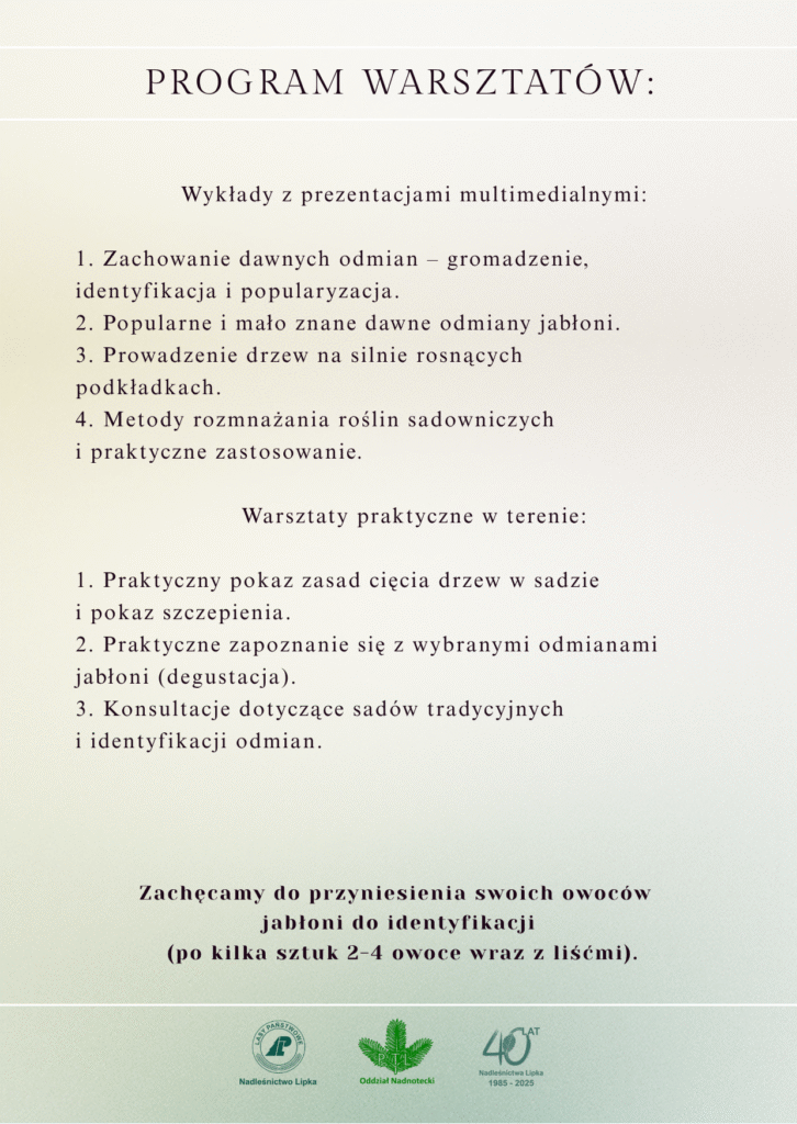 Nadleśnictwo Lipka zaprasza na warsztaty pt. ,,Zachowanie dawnych odmian roślin sadowniczych”, które odbęda się się w sali wiejskiej w Nowym Dworze – Nowy Dwór 2,