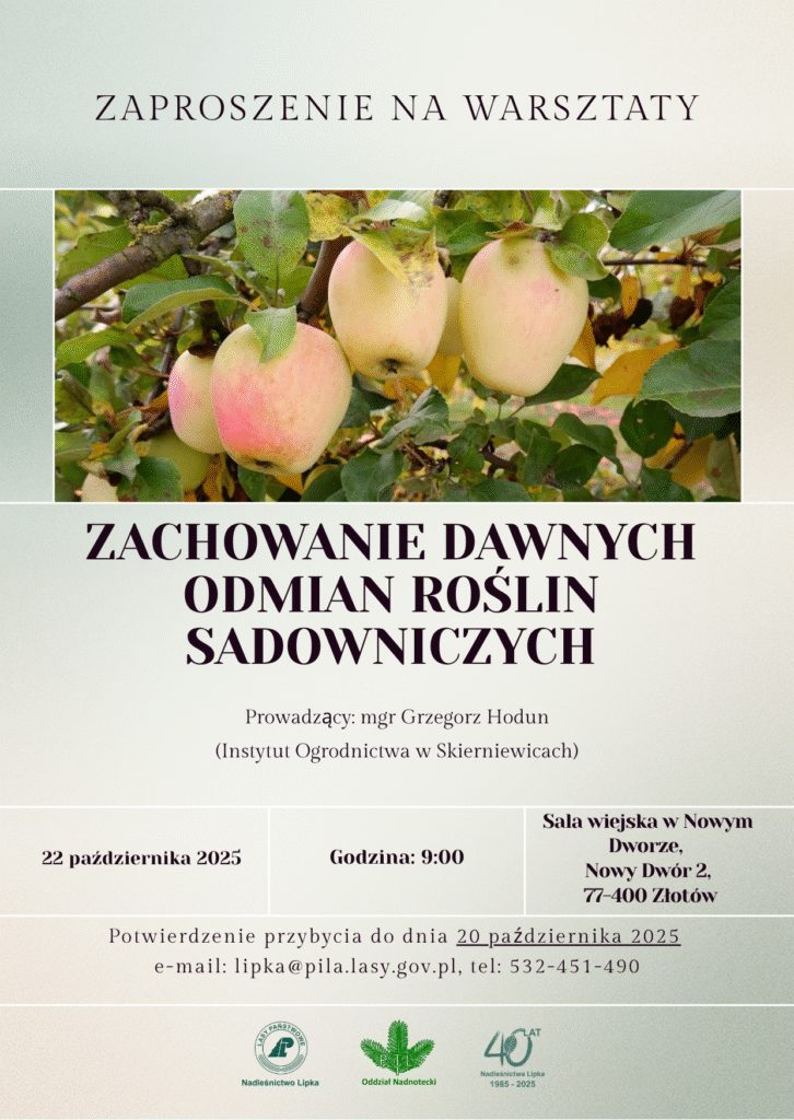 Nadleśnictwo Lipka zaprasza na warsztaty pt. ,,Zachowanie dawnych odmian roślin sadowniczych”, które odbęda się się w sali wiejskiej w Nowym Dworze – Nowy Dwór 2, 77-400 Złotów, o godz. 9:00.