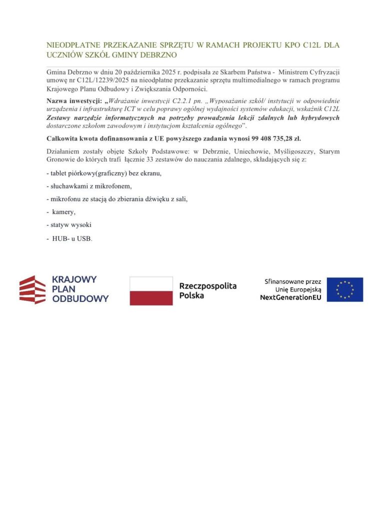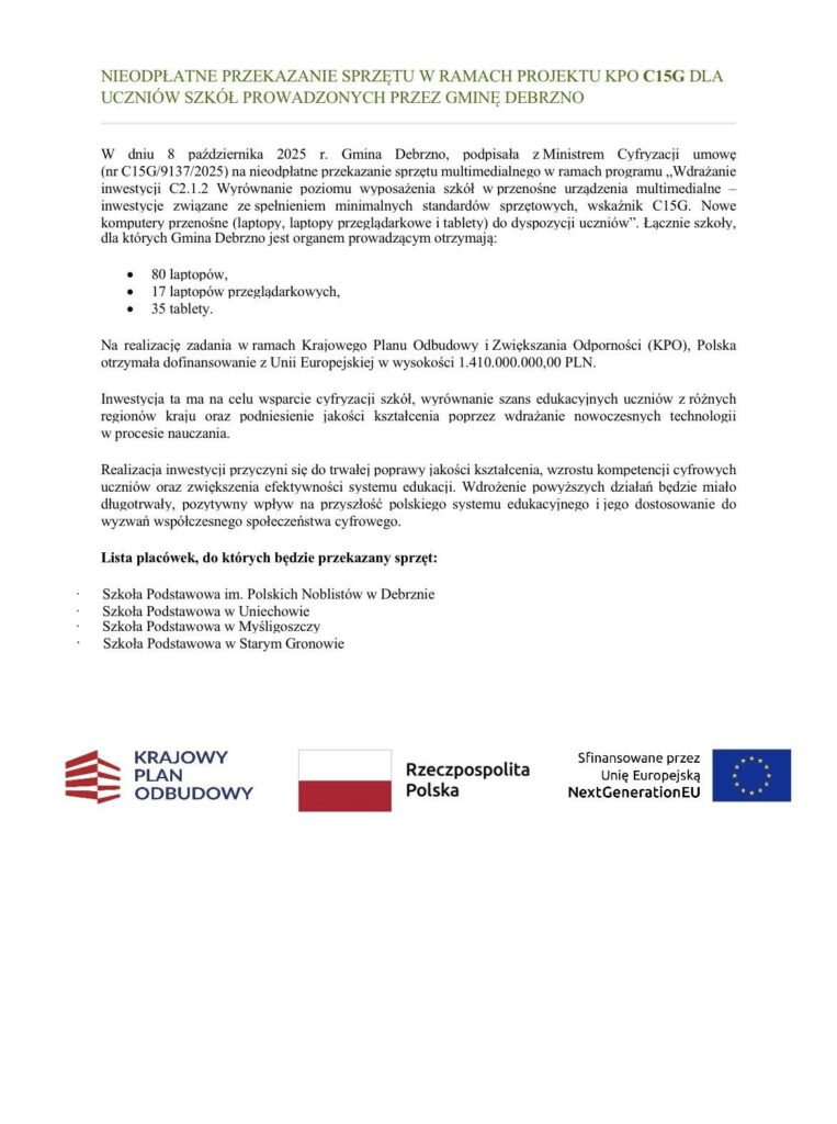 Gmina Debrzno podpisała z Ministrem Cyfryzacji umowy nr C15G/9137/2025 z dnia 8 października 2025 r. oraz nr C12L/12239/2025 z dnia 20 października 2025 r. dotyczące nieodpłatnego przekazania sprzętu multimedialnego w ramach Krajowego Planu Odbudowy i Zwiększania Odporności.